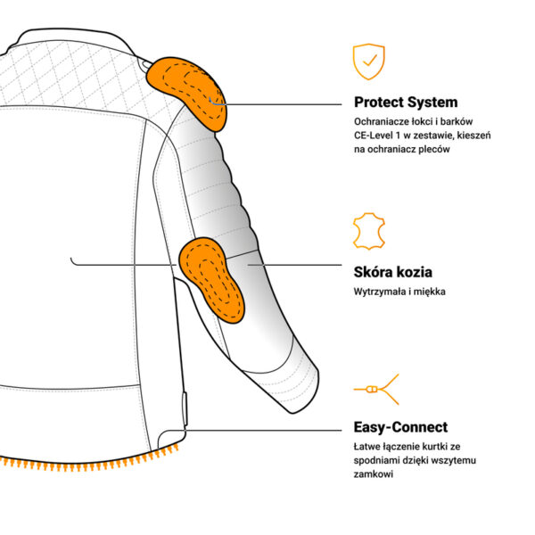 Kurtka motocyklowa skórzana Ozone Ramones Modern to casualowe podejście w odzieży motocyklowej. Wykonano ją z wygodnej i miękkiej skóry koziej. Ochronę newralgicznych miejsc zapewniają certyfikowane ochraniacze. Ozone Ramones Modern wyposażono w dodatkową kieszeń na ochraniacz pleców.