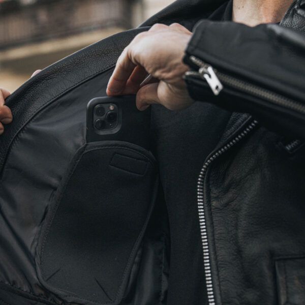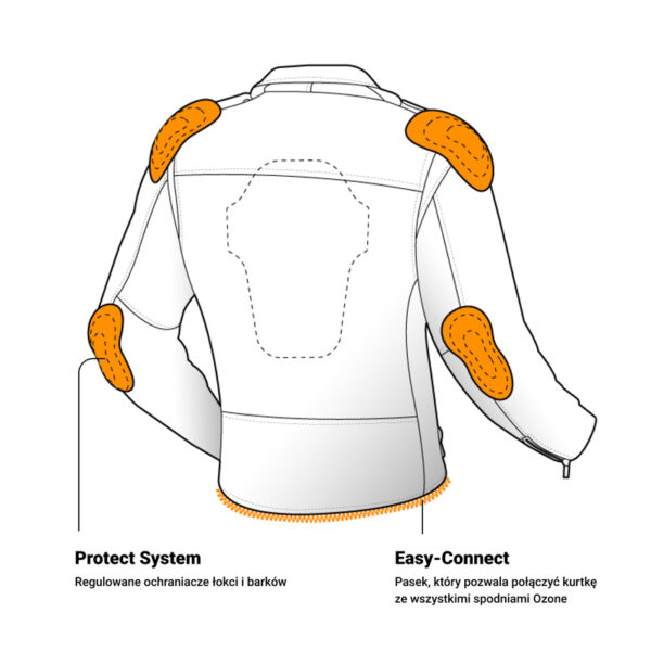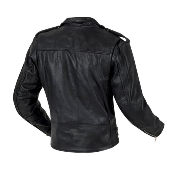 Motocyklowa kurtka skórzana z ochraniaczami łokci i barków CE Level 1 gwarantuje pełną ochronę. Ma dodatkową kieszeń na plecach dającą możliwość dołożenia ochraniacza. Regulacja w pasie pozwala na precyzyjne dopasowanie do każdej sylwetki. Ma kieszenie zewnętrzne i jedną wewnętrzną.