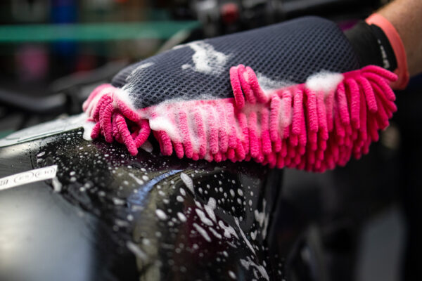 - Zanurz rękawicę w wiadrze z roztworem szamponu (np. Muc-Off Nano Tech Motorcycle Cleaner).